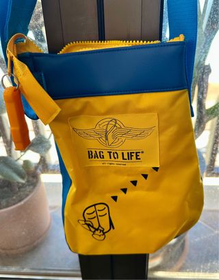 Bandolera de la marca Bag To Life, fabricada con chalecos salvavidas reciclados. - Combinación de colores azul y amarillo. - Cierre de cremallera. - Correa ajustable para llevar al hombro o cruzada. - Incluye un silvato colgante naranja.