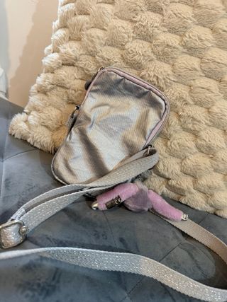 Bolso pequeño de la marca Kipling en color plateado con detalles en rosa. - Incluye un monito colgante. - Correa ajustable para llevar cruzado o al hombro. - Cierre de cremallera.