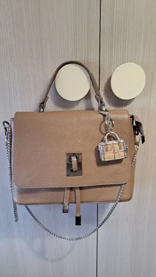Elegante bolso de piel en tono beige, perfecto para complementar tu estilo. - Acabado texturizado. - Cierre metálico. - Asa de mano y cadena. - Adorno colgante tipo mini bolso.