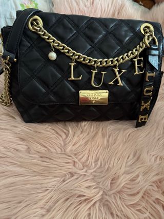Elegante bolso Guess Luxe de piel negra con detalles dorados. - Diseño acolchado. - Cadena dorada. - Charm con perla. - Letras LUXE colgantes. - Placa metálica Guess Luxe.