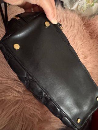 Bolso de pelo suave con detalles en negro. - Material exterior de pelo sintético. - Asas y detalles en piel sintética con acabado de cocodrilo. - Cierre de cremallera. - Incluye colgantes de llave y candado.