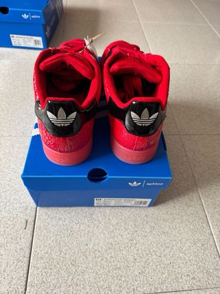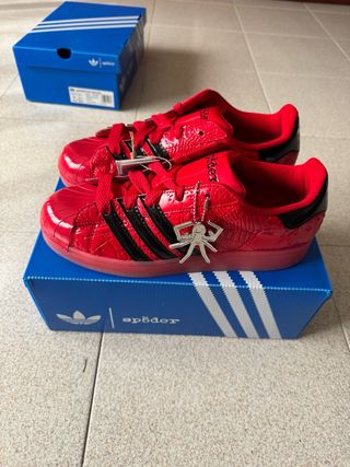 Zapatillas Adidas Superstar con un diseño llamativo en rojo y negro. - Detalle de telaraña en el exterior. - Tres rayas negras características de Adidas. - Colgante de araña plateado. - Caja original incluida.
