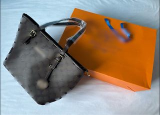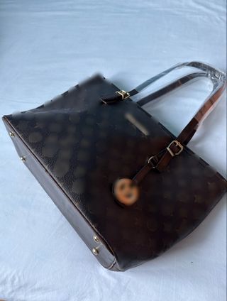 Bolso de mano con dos asas, correa adicional y un colgante para las llaves. Dos bolsillos exteriores, un bolsillo interior y dos departamentos interiores. Usado una vez.