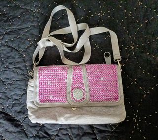 Original bolso de la marca Kipling. En color gris con pequeños botones morados (se ha caído alguno). Tiene varios compartimentos y colgante para llaves. Es pequeño pero muy cómodo y espacioso.