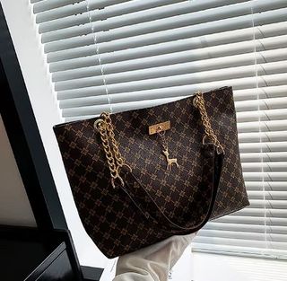 Elegante bolso de mano para mujer con un diseño de estampado geométrico. - Cadena dorada para llevar al hombro. - Adorno colgante de ciervo.