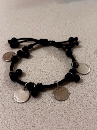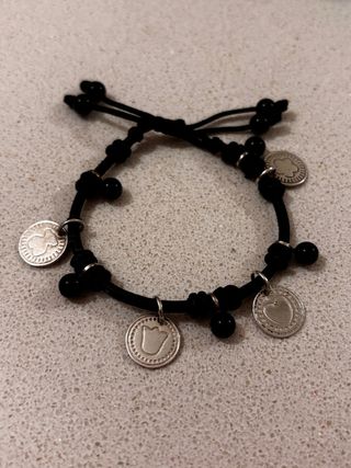 Pulsera de la marca Tous con detalles plateados. - Cordón negro. - Colgantes con motivos. - Cierre ajustable.