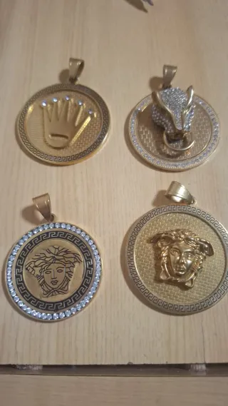 Set de cuatro colgantes de acero inoxidable con diseños inspirados en Versace. - Diseño de corona. - Diseño de cabeza de animal con incrustaciones. - Diseño de Medusa con borde de circonitas. - Diseño de Medusa. 10 unidad