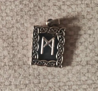 Colgante con diseño de runa M y borde trenzado. Plata de ley - Runa M central. - Borde con diseño celta. - Acabado plateado y negro.