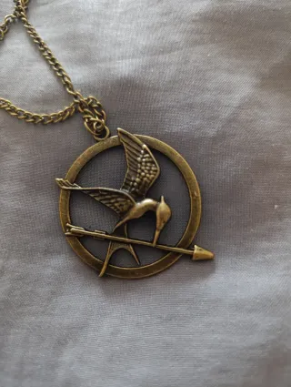 Colgante inspirado en el Sinsajo de Los Juegos del Hambre. Un accesorio con un diseño detallado. - Diseño del Sinsajo con flecha. - Cadena metálica. - color bronce. Colgante con cadena
