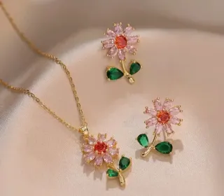 Precioso conjunto de joyería con diseño de flor. - Colgante con cadena. - Pendientes a juego. - Detalles en piedras rosas y rojas. - Hojas en piedras verdes.