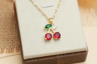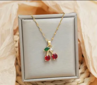 Colgante con diseño de cerezas en acero inoxidable. - Detalle de hojas verdes y circonitas sintéticas. - Cierre de mosquetón.
