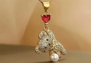 Este colgante es una pieza delicada y llamativa. - Diseño de oso detallado con incrustaciones. - Corazón rojo en la parte superior. - Perla colgante en la base. - Cadena dorada.