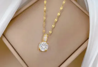 Elegante colgante con cadena de acero inoxidable y un brillante detalle de circonita. - Material: Acero inoxidable. - Diseño: Colgante con circonita central y detalles. - Color: Dorado y blanco.