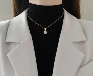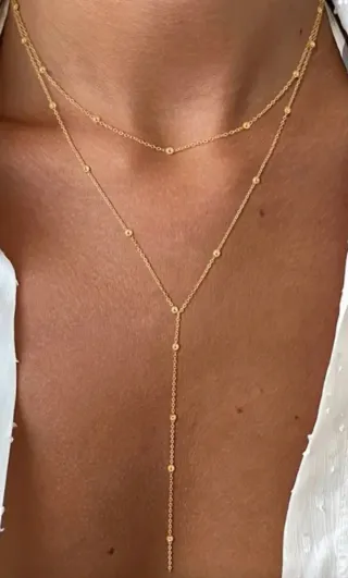 Elegante colgante de dos cadenas con pequeñas cuentas. - Chapado en oro 18 kilates. - Diseño delicado y moderno. - Cadena superior con cuentas espaciadas. - Cadena inferior con colgante en forma de Y.