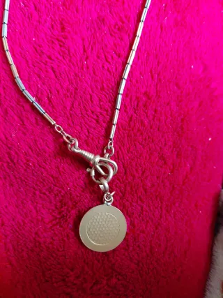 Elegante cadena con un colgante de estilo vintage. - Diseño de cadena con eslabones rectangulares. - Colgante circular con grabado. - Cierre de mosquetón.