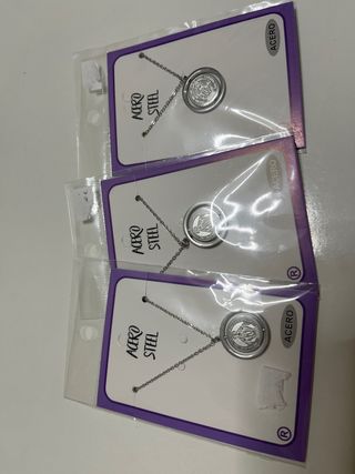 Colgante de acero con la medalla de San Benito. Cada unidad cuesta 10 euros. - Diseño de la medalla de San Benito. - Cadena de acero. - Cierre seguro.