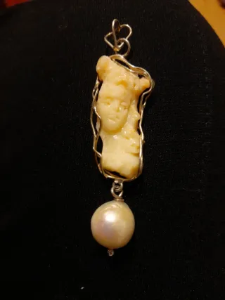 Colgante de plata italiana antigua con un diseño único. - Figura tallada en material beige. - Detalle de perla colgante.