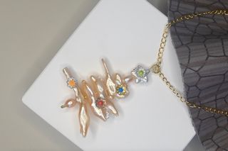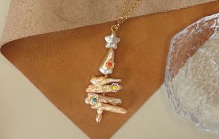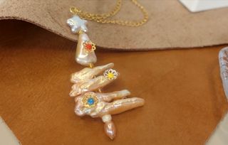 Colgante navideño original hecho a mano. La pieza principal está compuesta por varias perlas naturales de agua dulce, decoradas con flores de diversos colores. La forma irregular de las perlas barrocas hace que cada colgante sea único. Ideal para Navidad. - Perlas barrocas - Cadena dorada de 50 cm de largo - Perlas auténticas, no de plástico - Hecho a mano, sin afiliación a ninguna marca