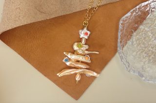 Colgante artesanal con forma de árbol de Navidad. La pieza principal está hecha de varias perlas barrocas naturales de agua dulce, decoradas con coloridas flores metálicas. Cada perla tiene una forma única. Perfecto para lucir esta Navidad. Son perlas auténticas, extraídas directamente de sus conchas. No son de plástico. Esta joya es artesanal; no pertenece a ninguna marca.
