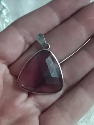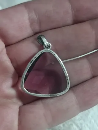 Precioso colgante antiguo con una piedra de amatista tallada en forma de triángulo. La montura es de plata. - Diseño triangular. - Piedra de amatista. - Montura de plata.