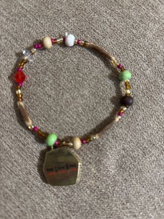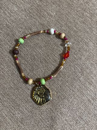 Pulsera artesanal inspirada en El Rey León. - Colgante con el rostro de un león. - Cuentas de madera y otros materiales. - Detalles en tonos dorados y verdes.