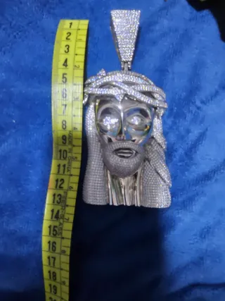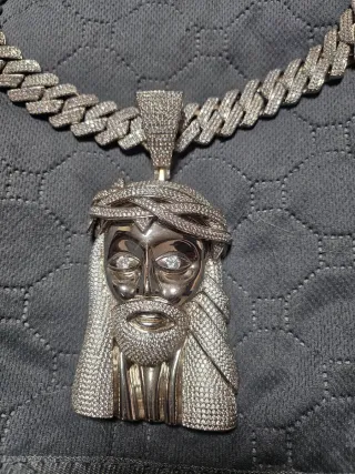 Colgante con diseño de Jesús, adornado con estilo moissanitas. - Diseño detallado de la cabeza de Jesús. - Incrustaciones de moissanitas brillantes. - Acabado plateado y dorado.