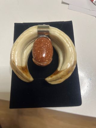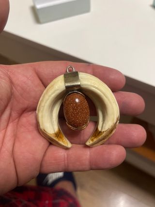 Colgante único con amoladeras de jabalí y una piedra del sol. original y echo a mano - Diseño en forma de herradura. - Combinación de tonos beige y dorado.