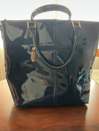 Elegante bolso de charol negro de la marca Eternel. Un accesorio sofisticado y práctico. - Acabado brillante. - Cierre de cremallera. - Detalle de colgante con el logo.