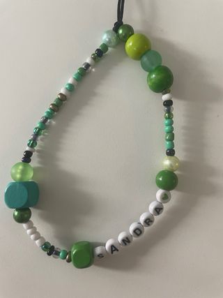 Este llavero o colgante para móvil está hecho a mano con una variedad de cuentas. - Cuenta con cuentas de colores verde y blanco. - Incluye cuentas con forma de cubo y cuentas con letras que forman el nombre SANDRA. - Incluye letras para personalizar. - El llavero es único y personalizado , son hechos amaño con mucho amor y cuidado Al ser hecho por encargo se necesita un margen de tiempo para realizar el on producto más el envío