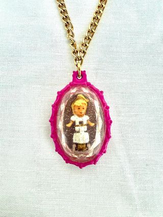 Colgante vintage de Polly Pocket con un diseño ovalado y cristalino. - Detalle de figura en miniatura. - Marco exterior de color rosa vibrante. - Cadena dorada estilo eslabones. -Completa 100%