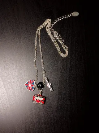 Conjunto de varios collares con diferentes colgantes. Se venden en lote o por separado. Los dos de la derecha son del Claire's • Collar con colgante Reliquias de la Muerte. (4€) • Collar con figura de hada. (3€) • Collar con colgante de llave que cambia de color con la temperatura. (6€) • Collar con piedra facetada. (5€) • Collares con abalorios temáticos (bandera Reino Unido, autobús). (7€)