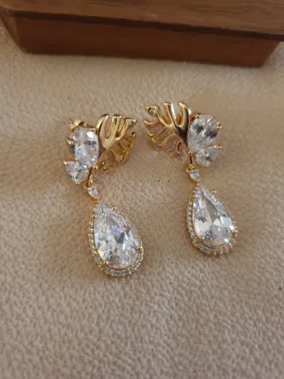Elegantes pendientes con un diseño inspirado en la naturaleza, chapados en oro y adornados con circonitas brillantes. - Diseño de hoja con lágrima colgante. - Detalles de pequeñas circonitas en la hoja. - Circonita principal en forma de lágrima. - Acabado brillante.
