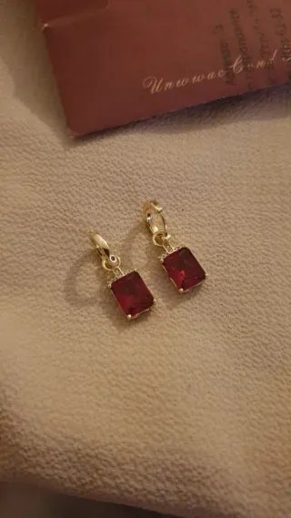 Elegantes pendientes chapados en oro con una llamativa piedra central de color rojo. El diseño se complementa con pequeños detalles brillantes alrededor de la gema principal y en la cadena que une el pendiente al cierre. - Diseño colgante. - Cierre de presión.