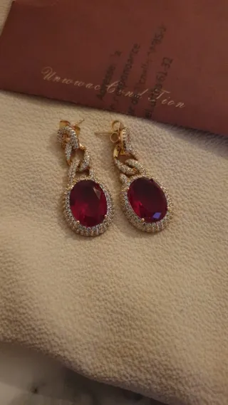 Elegantes pendientes chapados en oro con un llamativo diseño. - Detalle de circonitas incrustadas. - Colgante ovalado con piedra roja. - Cierre de presión.