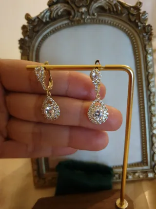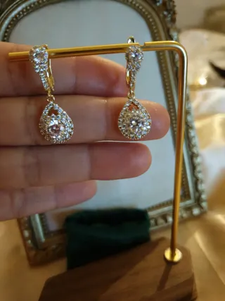 Elegantes pendientes con baño de oro y detalles de circonitas. - Diseño colgante con forma de lágrima. - Adornados con pequeñas circonitas brillantes. - Cierre de presión seguro.