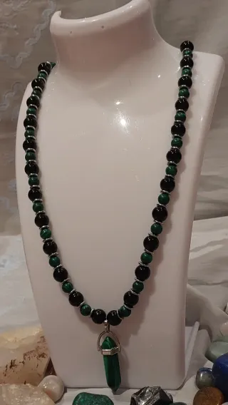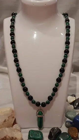 Elegante collar con piedras naturales de malaquita y obsidiana. El colgante central es una piedra de malaquita tallada en forma de prisma. Cuentas de malaquita y obsidiana.6mm,8mm - Colgante de malaquita tallada. - Cierre metálico.La combinación de Malaquita y Obsidiana es poderosa para la protección energética profunda y la sanación emocional, con la malaquita transformando bloqueos y miedos y la obsidiana actuando como escudo protector, ayudando a liberar traumas, integrar sombras y fomentar un crecimiento personal y espiritual a través de la autoaceptación y la claridad, ideal para quienes están en procesos de cambio .