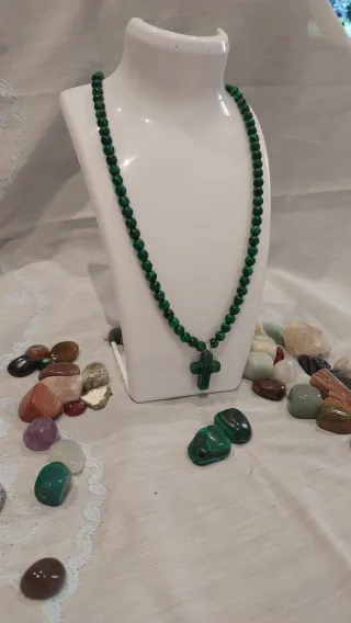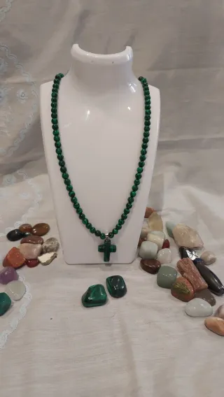 Elegante collar con cuentas de piedra natural malaquita y un colgante en forma de cruz.- Cuentas de malaquita de 6mm. - Colgante con diseño de cruz.La malaquita es la piedra de la transformación, la protección y la sanación emocional, actuando como un escudo contra energías negativas, ayudando a superar miedos y bloqueos, y fomentando el crecimiento personal y la confianza, conectando especialmente con el chakra del corazón para equilibrar emociones y promover la paz interior. -24cm