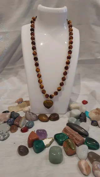 Elegante collar con cuentas de piedra natural ojo de tigre de 8mm y un colgante en forma de corazón.Piedra natural ojo de tigre.Cuentas de 8mm,22cm. - Colgante con forma de corazón.El Ojo de Tigre es una piedra espiritual de protección, fortaleza y claridad, conocida por atraer la prosperidad y reforzar la confianza en uno mismo, actuando como un escudo contra energías negativas y mal de ojo. Se asocia con los chakras del plexo solar y raíz, aportando estabilidad, voluntad y disciplina para alcanzar metas, y se usa para equilibrar emociones y promover la perspicacia.