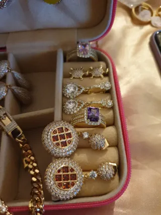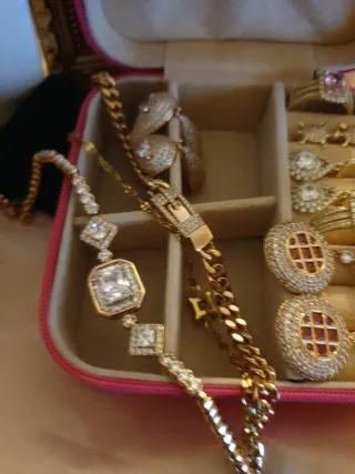 Conjunto de joyas chapadas en oro, presentado en un joyero. - Collares con colgantes. - Anillos con piedras. - Pendientes a juego. - Pulsera con detalles brillantes.