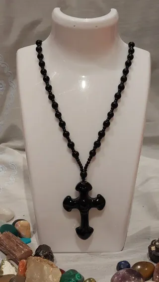 Elegante collar con colgante en forma de cruz, elaborado con piedra natural de obsidiana. Diseño de cruz - Piedra natural de obsidiana - Cuentas negras 6mm, 40cm