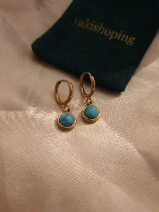 Elegantes pendientes chapados en oro con una piedra de turquesa. - Diseño de aro. - Colgante con piedra redonda. - Acabado dorado.