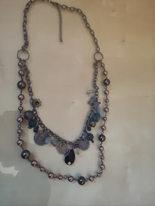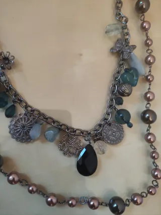 Elegante collar de mujer con múltiples colgantes y cuentas. - Diseño de doble cadena. - Colgantes variados, incluyendo monedas y formas florales. - Detalle de una lágrima negra central. - Cuentas de perlas y otras decorativas.