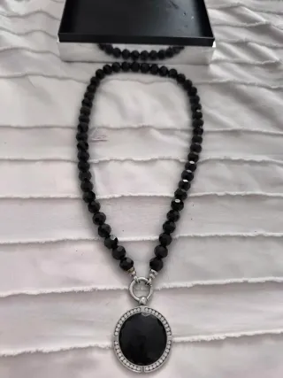 Elegante colgante de la marca Maeloc con un diseño llamativo. - Colgante con piedra negra ovalada. - Cadena de cordón negro. - Cierre de mosquetón plateado.
