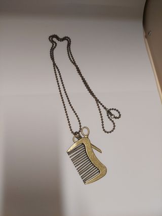 Collar con colgante plateado de bruja de bruja montada en escoba. Es ajustable porque es de cuerda negra corredera (unos de los nudos se ha deshecho, habría que volver a atarlo). Tiene muchos años pero apenas tiene uso.