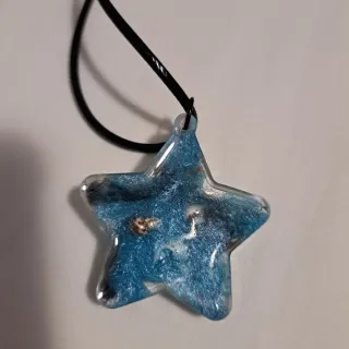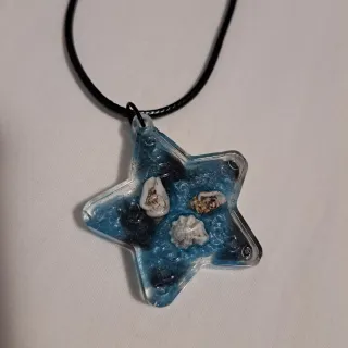 Colgante artesanal con forma de estrella, encapsulado en resina epoxy. - Diseño único con elementos marinos. - Acabado brillante y transparente. - Incluye cordón para llevarlo. - Ideal como accesorio original.