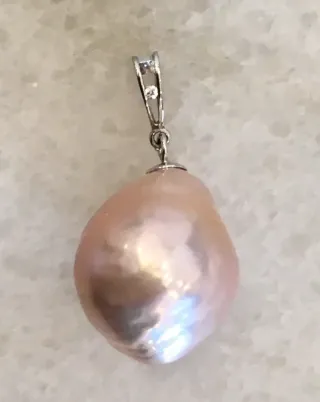 Elegante colgante con una perla Kasumi Aurora de gran tamaño de 18,3 x15 mm, de calidad superior 6A. Color Rosa. Plata de primera ley 925 con Circonita. Pieza única. Certificado! - Perla de forma irregular. - Colgante con enganche de plata.