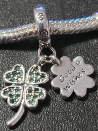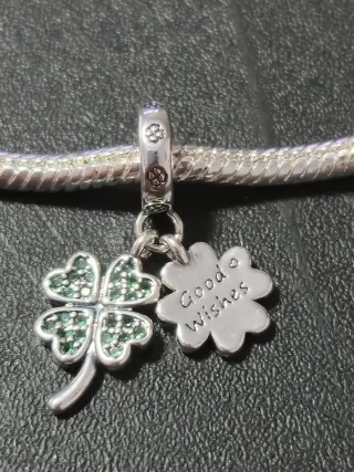Este encantador colgante presenta un diseño de trébol de cuatro hojas, adornado con brillantes circonitas verdes. Un detalle adicional es una pequeña flor con la inscripción Good Wishes. NO ES PANDORA. NO ES PLATA - Colgante con forma de trébol de cuatro hojas. - Decorado con pequeñas piedras verdes. - Incluye un charm adicional con texto Good Wishes.