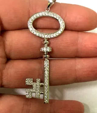 Precioso colgante Llave de plata de primera ley 925 con Circonitas. Baño de rodio. Es grande, 5,4 cm de largo y 2,25 cm de ancho, 5,85 gramos. - Diseño detallado en forma de llave. - Incrustaciones de piedras que aportan un toque de brillo. - Fabricado en plata.