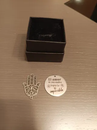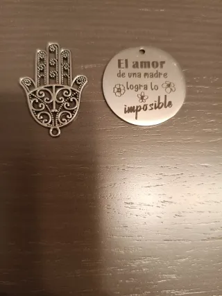 Conjunto de colgantes con un diseño de la mano de Fátima y una frase inspiradora. - Colgante con forma de mano de Fátima. - Colgante redondo con la frase El amor de una madre logra lo imposible y detalles florales. - Color plateado. Acero - Sin cadena. - Los dos miden 3 cms