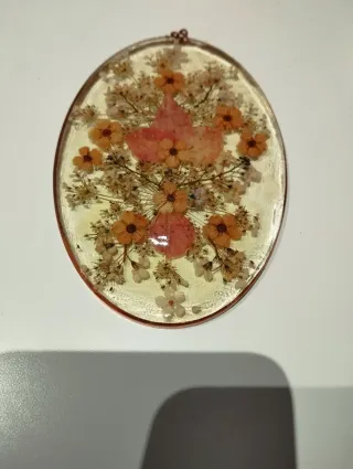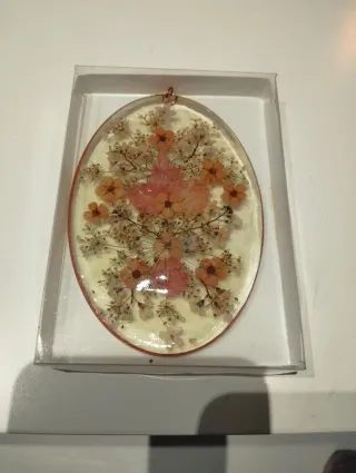 Precioso colgante ovalado con flores secas prensadas en resina. - Flores secas naturales. - Diseño floral delicado. - Montura metálica. Mide11 cm de alto por 7 cm de ancho